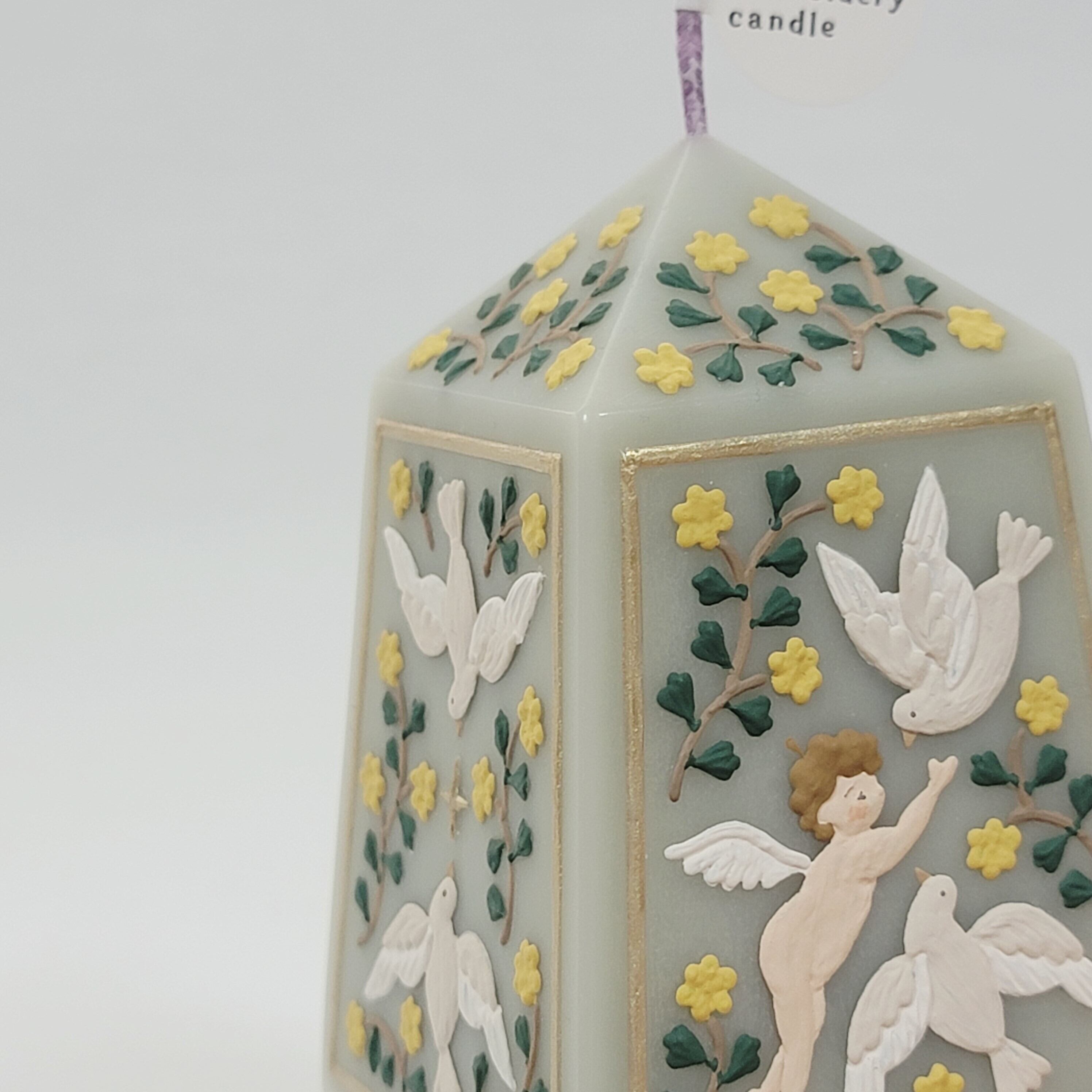 小花に囲まれた愛らしい鳩と天使のデザインを施したキャンドルです。